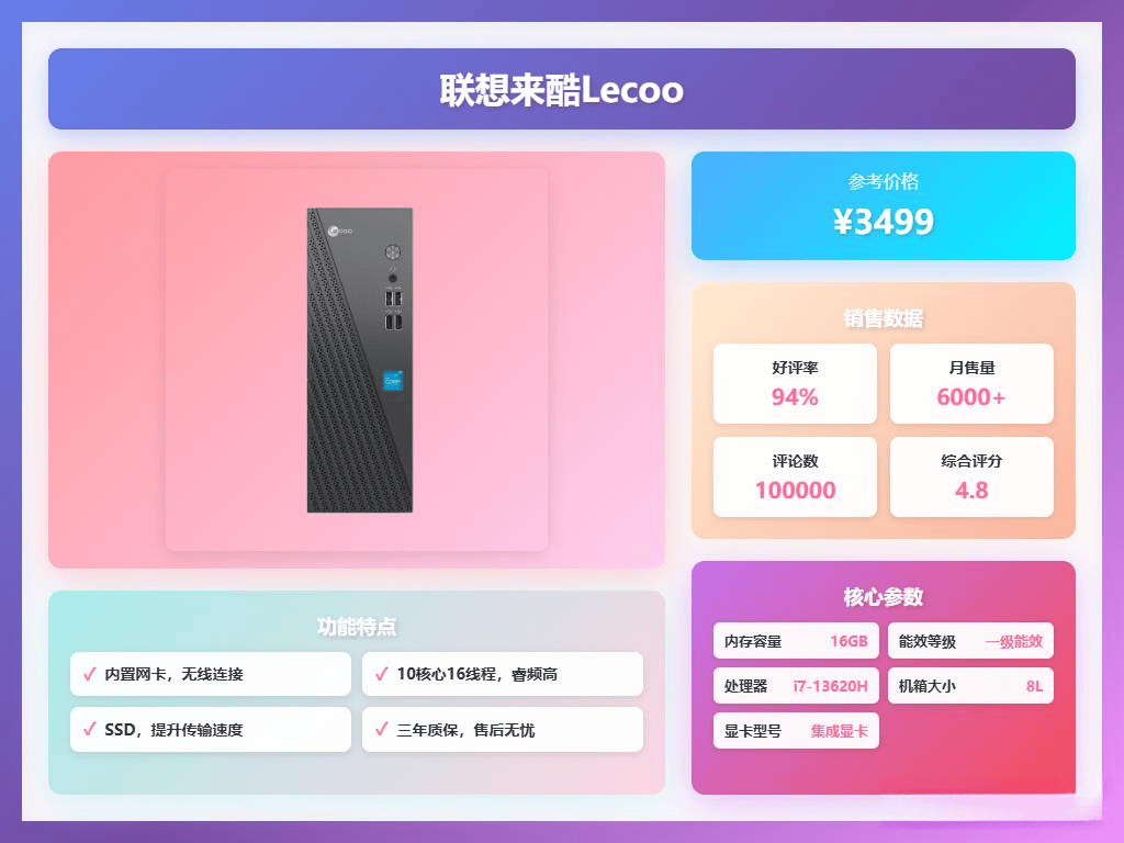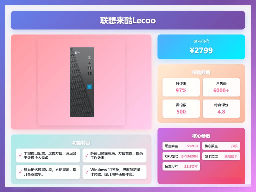 在选购时,能够准确的通过自己的实际需求,权衡一下性能、价格和便携性等因素,选择最适合自己的来酷电脑主机。重点关注处理器、内存和硬盘容量,别忘了看看接口是否够用哦!